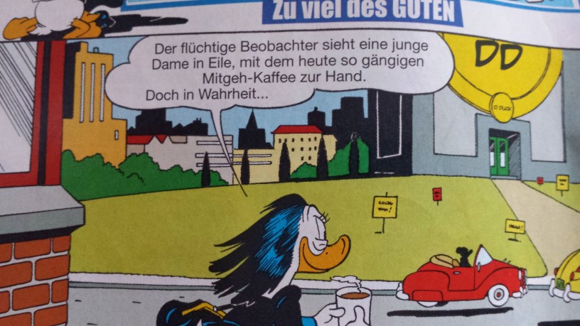 Gefunden habe ich diese Übersetzung in einer älteren Donald Duck-Geschichte „Zu viel des GUTEN“. Damals übersetzte man eben Coffee-to-go in Mitgeh-Kaffee. Zum allgemeinen Verständnis ist das schon einfacher.