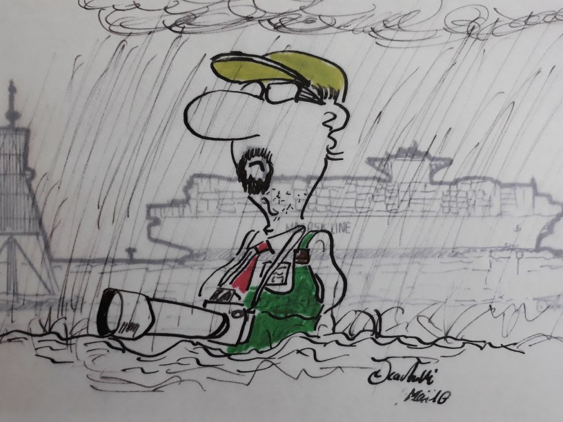 Hier erscheint, ab heute jeden Donnerstag, der Cuxhaven-Cartoon. Heute mit dem Thema: „Immer bereit, auch bei schlechten Wetter, die Ship-Spotter an der Kugelbake.“