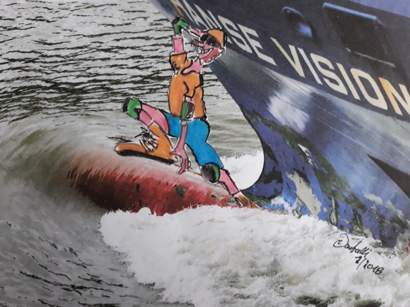 Hier erscheint jeden Donnerstag, der Cuxhaven-Cartoon. Heute mit dem Thema „Kreative Cuxhavener erfinden neuartige Sportarten, wie hier das Bigship-Surfen. Einzigartig nur hier auf der Elbe. (Beispiel 2, weitere folgen)