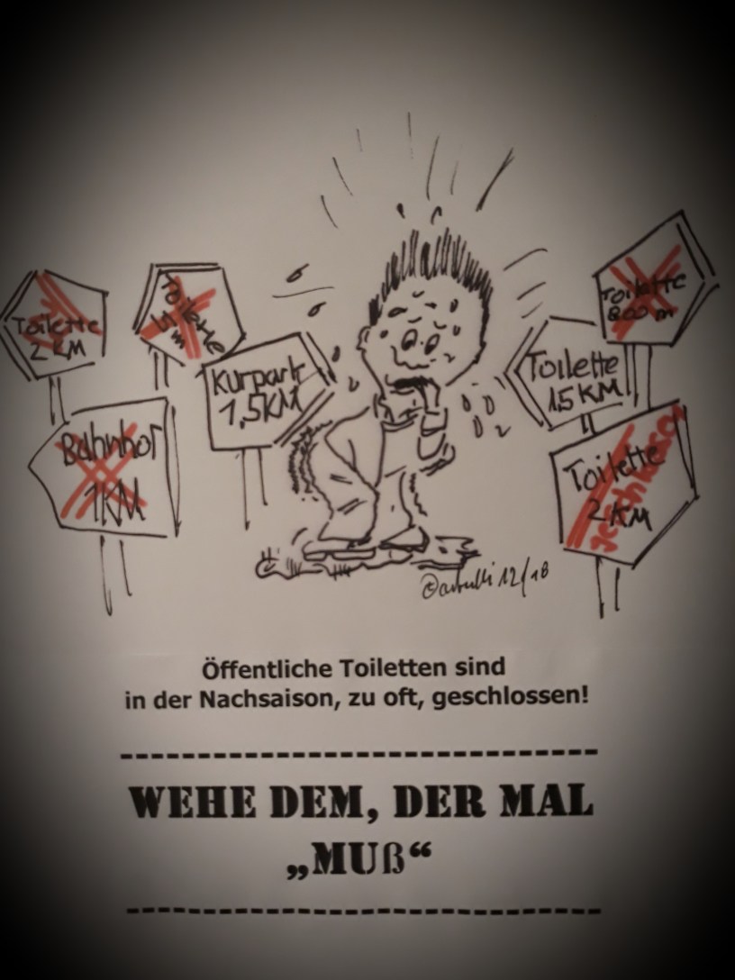 Öffentliche Toiletten sind für eine Touristenstadt mit Strand und Promenade, wie Cuxhaven, sehr wichtig. Was aber, wenn in der Nachsaison, fast 50% dieser Toiletten geschlossen sind. Besonders die, die sich in der Nähe von Strand und Promenade befinden. Das zeigt der neue Cuxhaven-Cartoon.