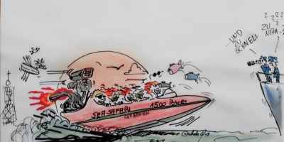 Neuer Cuxhaven-Cartoon: „Das Meer hautnah erleben“ lautet der Slogan von Sebastian Böhms „Sea Safaris“. Er bietet Powerboat-Touren bis nach Neuwerk an. Wir in Cuxhaven reden über Klima-, Umwelt- und Naturschutz und dann muss einer unbedingt mit 600 PS das Wattenmeer umpflügen. Ich bin sprachlos!! Dazu der neue Cuxhaven-Cartoon