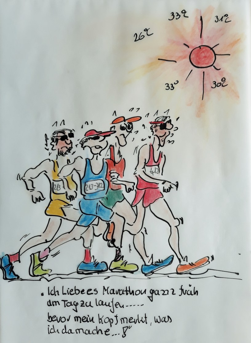 Neuer Cuxhaven-Cartoon: Einen Marathon der besonderen Art gab es in Altenwalde – Der „Das-schaffst-Duhuuu-sowieso-nicht-Marathon“. Das hört sich hart an, war es auch. Sieben Läufer, 60 Runden von 700 Meter, bei brütender Hitze von 33 Grad Celsius.