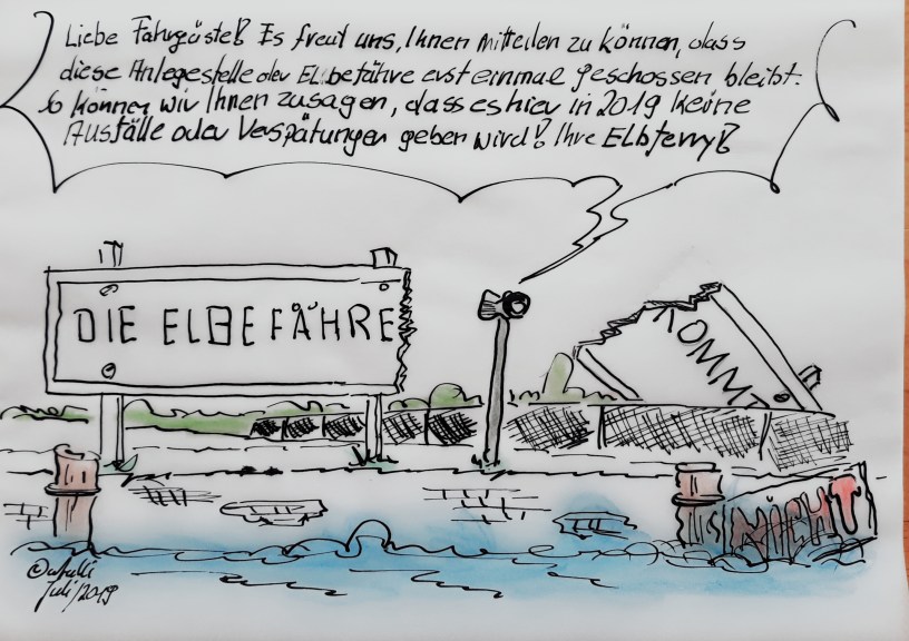 Neuer Cuxhaven-Cartoon: Liebe Fahrgäste der Elbefähre! Es freut uns, Ihnen mitteilen zu können, daß diese Anlegestelle der Elbefähre erst einmal geschlossen bleibt. So können wir zusagen, daß es hier in 2019 keine Ausfälle und Verspätungen geben wird. Ihre Elbferry!