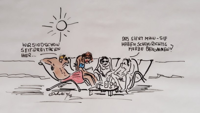 Neuer Cuxhaven-Cartoon: Sommer, Sonne, Sonnenschein. Es wird wieder heiß in Cuxhaven – bis zu 30 Grad soll es werden. Also ab in den Liegestuhl, in den Strandkorb, auf das Badetuch. Die Straßen sind voll in Cuxhaven. Klares Zeichen: Der Tourismus in Cuxhaven boomt.