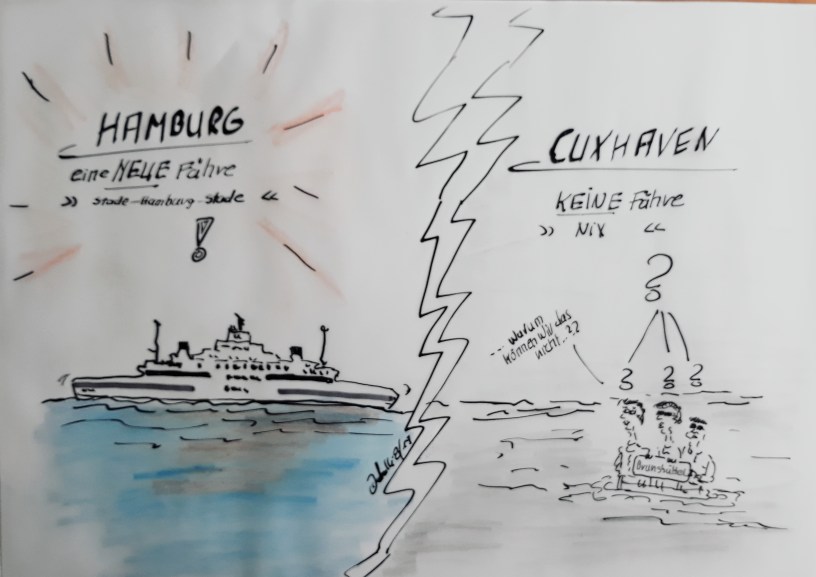 Neuer Cuxhaven-Cartoon: Neue Elbefähre – die können das. Die neue Stader Elbfähre, die ab dem 5. August Stadersand mit dem Fischmarkt in Altona verbinden wird. Warum aber wir nicht?