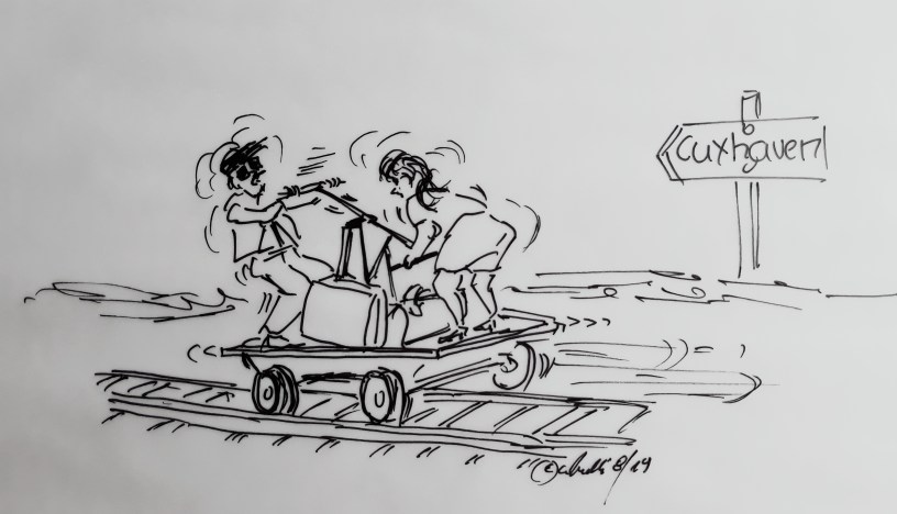 Neuer Cuxhaven-Cartoon: Beim Bahnverkehr Cuxhaven-Hamburg fallen, wegen Bauarbeiten, wieder Züge aus. Es wird mal wieder auf den Bahn-Ersatz-Verkehr gesetzt.