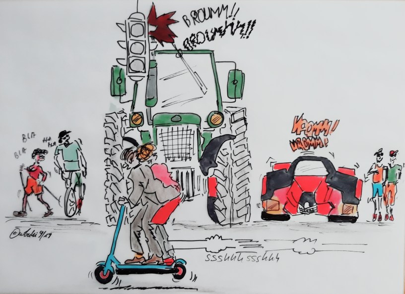 In Cuxhaven ist echt immer etwas los. ….Treffen von Einheimischen und Touristen an einer Kreuzung im Cuxhavener-Umland … (Einer der Läufer im Bild ist unser Karikaturist cartulli). Auch die e-Scooter-Fahrer sind dabei.