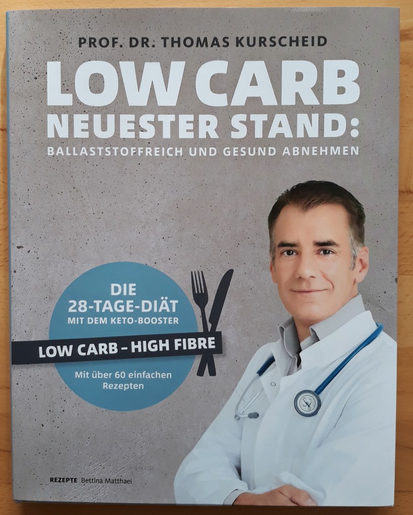 Im Buch Low Carb neuester Stand von Prof. Dr. Thomas Kurscheid dreht sich alles um das Thema ballaststoffreich aber auch gesund abnehmen. Das Besondere an der vorgestellten 28-tägigen KETO-Diät und den über 60 Rezepten von Bettina Matthaei ist die Kombination aus einem hohen Ballaststoff- und einem geringen Kohlenhydratanteil. Im Ganzen ist das Buch ein umfassender Ratgeber, der den Leser mit viel aktuellem Wissen rund um das Thema einer gesunden Low-Carb – High-Fibre-Ernährung versorgt.