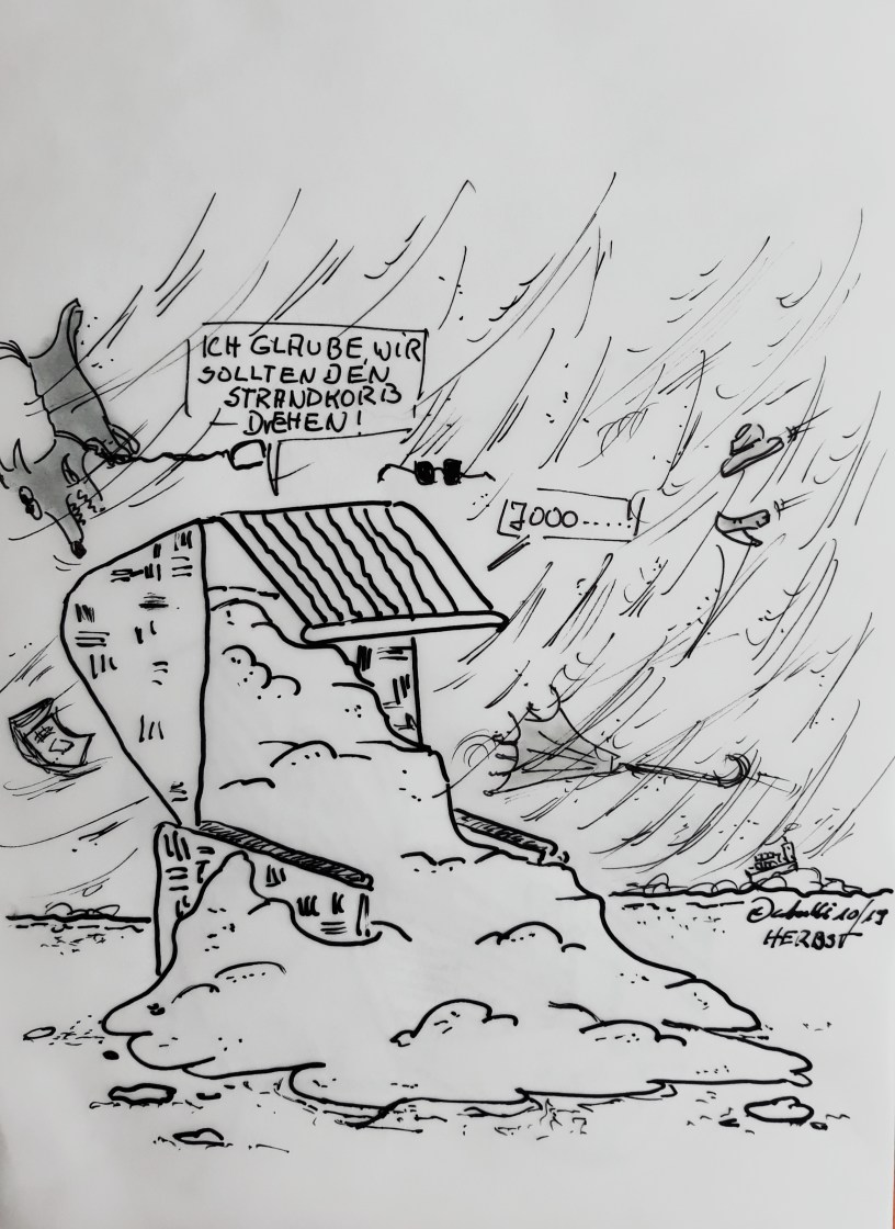 Neuer Cuxhaven-Cartoon: Durch die Faszination von Sturm, Wind und Wellen, kann man an der Nordseeküste abschalten und den Alltag hinter sich lassen. Vor allem im Winter und Herbst kann es an der Nordseeküste an manchen Tagen ziemlich stürmisch zugehen. Beachten Sie also bitte beim Spaziergang die eigene Sicherheit.
