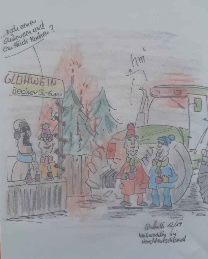 Neuer Cuxhaven-Cartoon: Weihnachten in Norddeutschland: Man steht mit einem Glühwein im Nebel, ab und zu sagt einer „hhmmm“ und dann gibt es ein stückchen Kuchen. Im Hintergrund sieht man eine Trecker. Das ist „Weihnachten in Norddeutschland“!
