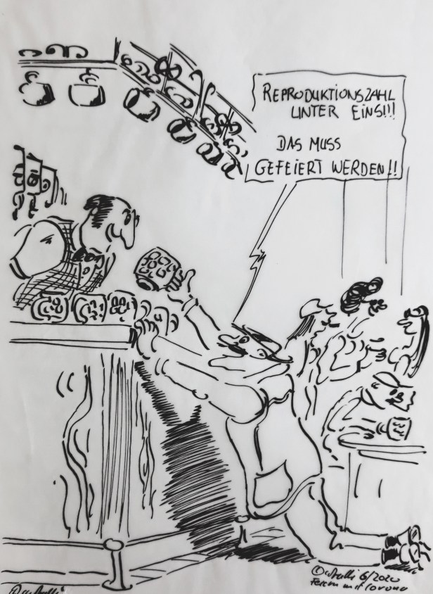 NEUER CUXHAVEN-CARTOON: „Die Reproduktionszahl war wieder unter Eins!! – Das muss unbedingt gefeiert werden“.