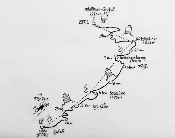 Vom Parkplatz der Nebelhorn-Bahn auf das Nebelhorn (2.224 m), etwa 10 km und 1.405 Höhenmeter. Runde 2 km der Strecke sind flach, das heißt, auf gut 8 km geht es nur Bergauf – und wie! Hat es schon der 1. Anstieg zur Seealpe (1.280 m) in sich, ist jener im „Latschenhang“ hinauf zur Station Höfatsblick (1.932) etwas vom steilsten, was ich die letzten Jahre gelaufen – nein, besser ausgedrückt, flott gegangen bin. Laufen war hier nicht mehr möglich. Die letzten knapp 300 Höhenmeter, auf etwas weniger als 2 km Distanz, waren dann wieder „halbwegs normal“.