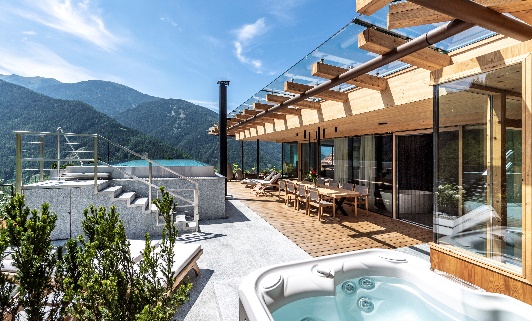 Beim privaten In- und Outdoor Dining können Familienmitglieder ganz unter sich sein und im Anschluss am offenen Designkamin herrlich entspannen. 18 Meter verbaute Glasfassaden lassen Natur und Wohnräume verschmelzen und eröffnen einen beeindruckenden Blick auf das UNESCO-Weltnaturerbe Dolomiten.