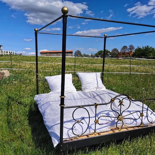 „Viele Menschen finden momentan wieder Kraft und Lebensfreude in der Natur, daher haben wir ein Bett mitten ins Grüne gestellt, auf dem sich unsere Gäste unter freiem Himmel hinlegen und entspannen können“, erklärt Elisabeth Zintl die originelle Idee zur Wiedereröffnung. Das Bett befindet sich in der idyllischen Natur rund um die Hollerhöfe. Wem es dann doch zu frisch wird, der kann sich natürlich in den teilweise denkmalgeschützten Häusern der Hollerhöfe einmieten.