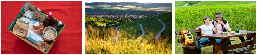 Bei einer Wanderung im Fränkischen Weinland, zum Beispiel auf den sogenannten „Wegen zum Wein“, wird der Weinberg zu Fuß erlebbar. Urlauber genießen die Aussicht auf die Weinreben, erfahren nebenbei einiges zum Weinanbau und entdecken Besonderheiten wie die Weinbergsterrassen. In der Gegend um Thüngersheim werden außerdem die Brotzeitkisten der Winzerfamilie Bauer direkt in den Weinberg geliefert. Die Brotzeit wird einen halben bis einen Tag vor der Wanderung ausgesucht und per E-Mail, Telefon oder Whatsapp bestellt, auf der Website können Gäste die aktuelle Speisekarte lesen.