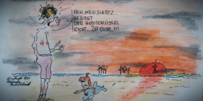 NEUER CUXHAVEN-CARTOON: Sonnenuntergang am Nordsee-Strand und der Autoschlüssel bleibt verschwunden.