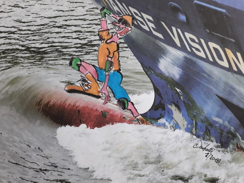 CUXHAVEN-CARTOON: BigShip-Surfen statt S-Bahn-Surfen – Ein neuer Trend für lebensmüde Extremjunkies macht sich breit. Nach Rooftoping, S-Bahn-Surfen usw., kommt das neueste von der Elbe – das Containership-Surfen. Verrückte Extremjunkies riskieren hier ihr Leben für den Adrenalinkick und spektakuläre Bilder.