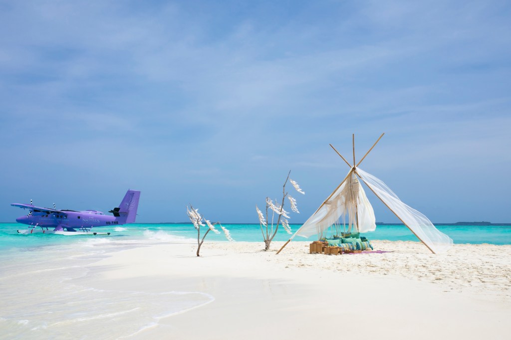 Da die Mitarbeiter sich um das Gepäck – das desinfiziert wird – und die Einreiseformalitäten kümmern, müssen die Gäste nicht mit anderen Urlaubern in der Schlange stehen. Anschließend fliegen sie mit dem privaten Wasserflugzeug des Resorts vom Flughafen direkt zur Insel.