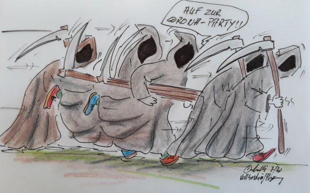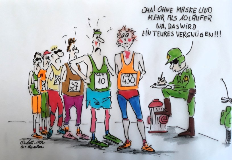 NEUER CUXHAVEN-CARTOON: 18.10.2020 – Sonntag Cuxhaven-Marathon – 800 (!!) Läufer zugelassen – über 7000 Corona Neuinfektionen in Deutschland – steigendes Infektionsrisiko! Da ist die Frage erlaubt: Marathon, 800 Läufer, muß das sein? Ich meine NEIN! Leute, ihr könnt doch auch alleine Laufen, macht genauso viel Spaß und das Infektionsrisiko geht gegen Null. So ist es dann viel sicherer.