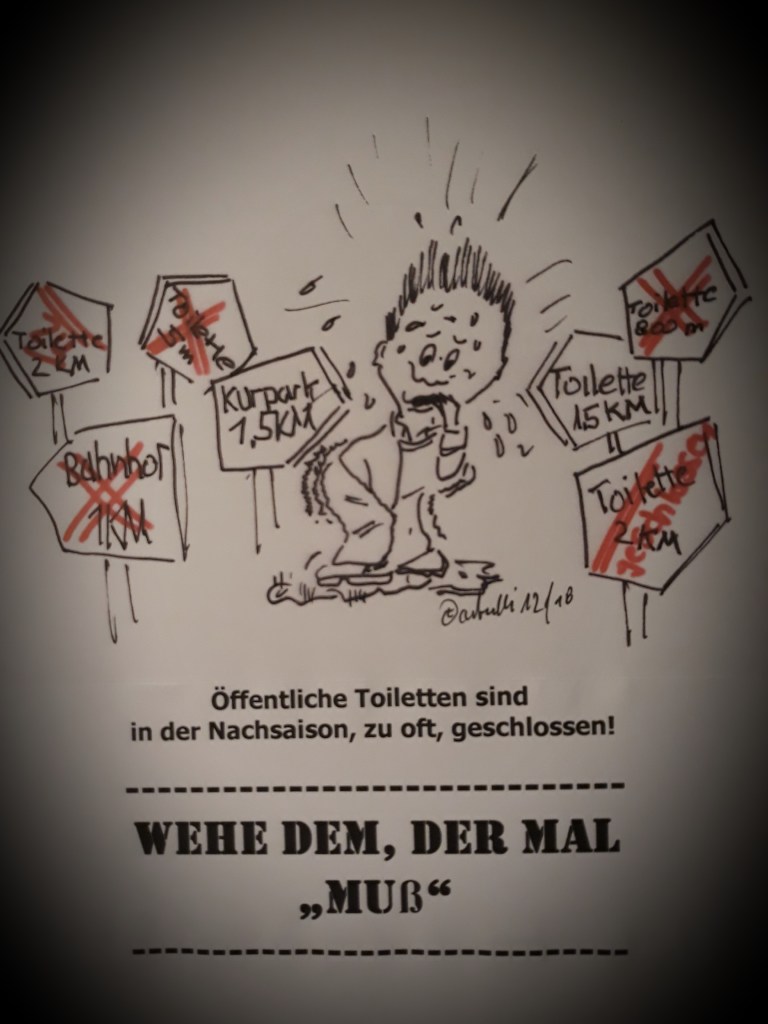 NEUER CUXHAVEN-CARTOON: Es ist Nachsaison, und die öffentlichen Toiletten sind dann, zu oft, geschlossen. WEHE DEM, DER MAL „MUSS“.