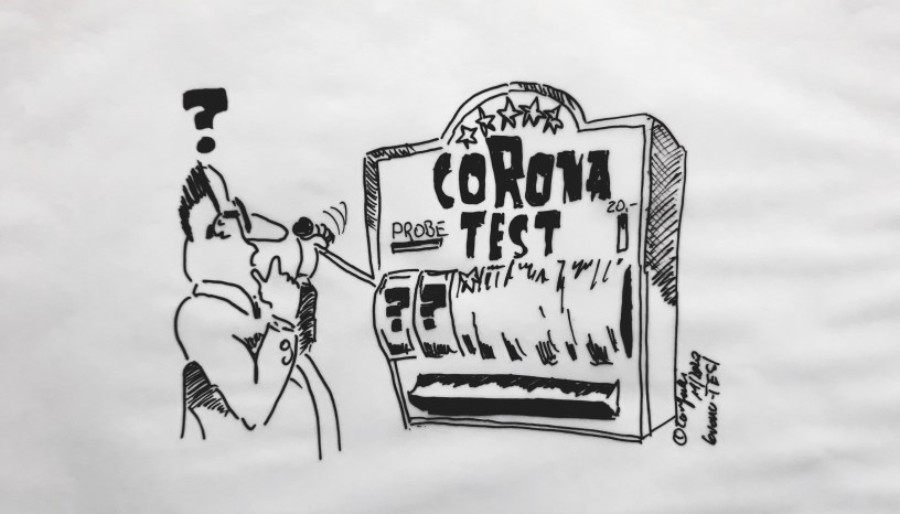 cartulli’s Corona-Cartoon: Eigentlich ist es doch schlimm genug. Uns drangsaliert ein Virus. Das ist schlimm. Sicher, aber man kann sich ja testen lassen und dann ist da ja noch der Impfstoff.