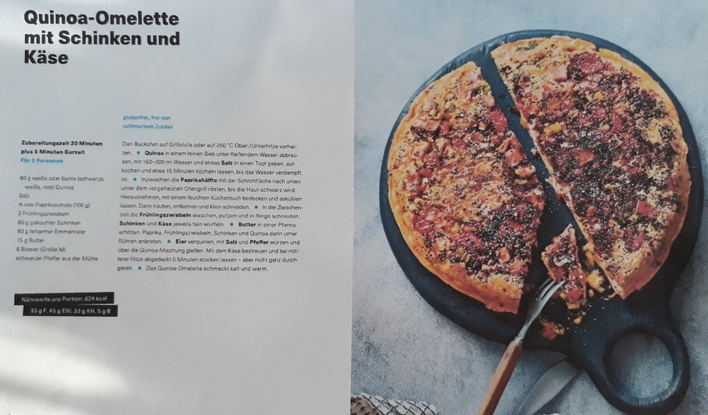 Mein erstes Proberezept war „Quinoa-Omlette mit Schicken und Käse“ und es schmeckte super lecker. So kann man dann auch folgende Aussage von Henze sehr gut verstehen: „Wenn wir gute Rezepte haben, die einfach Spaß machen und köstlich schmecken, verliert eine Diät ihren Schrecken!“ Kann ich nachvollziehen.