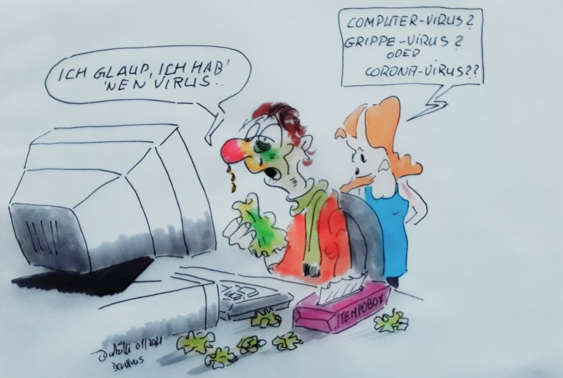 cartulli’s Corona-Cartoon: Die Corona-Krise hat uns fest im Griff. Da weiß man nicht immer welcher Virus denn gerade dran ist. Computer-Virus – Grippe-Virus – Corona-Virus ???