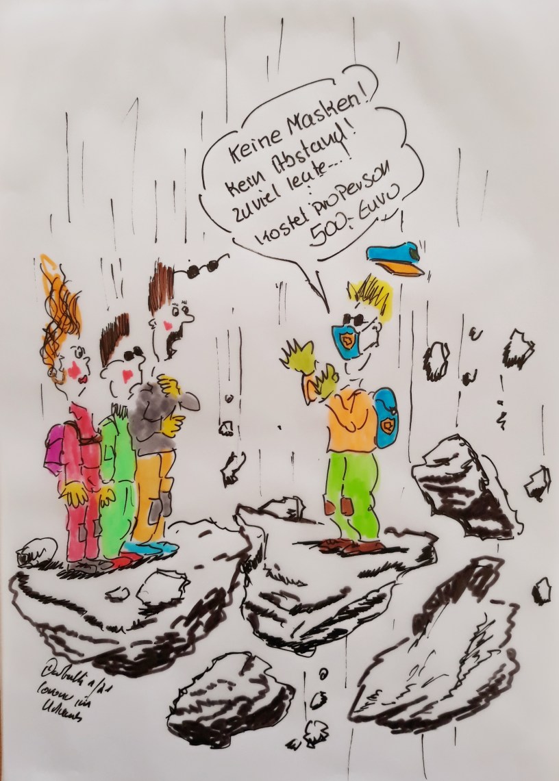 cartulli’s Corona-Cartoon: Auch beim Wandern in den Bergen ist jetzt Pflicht: Abstand, Masken-Pflicht, und ….Sonst wird es teuer!