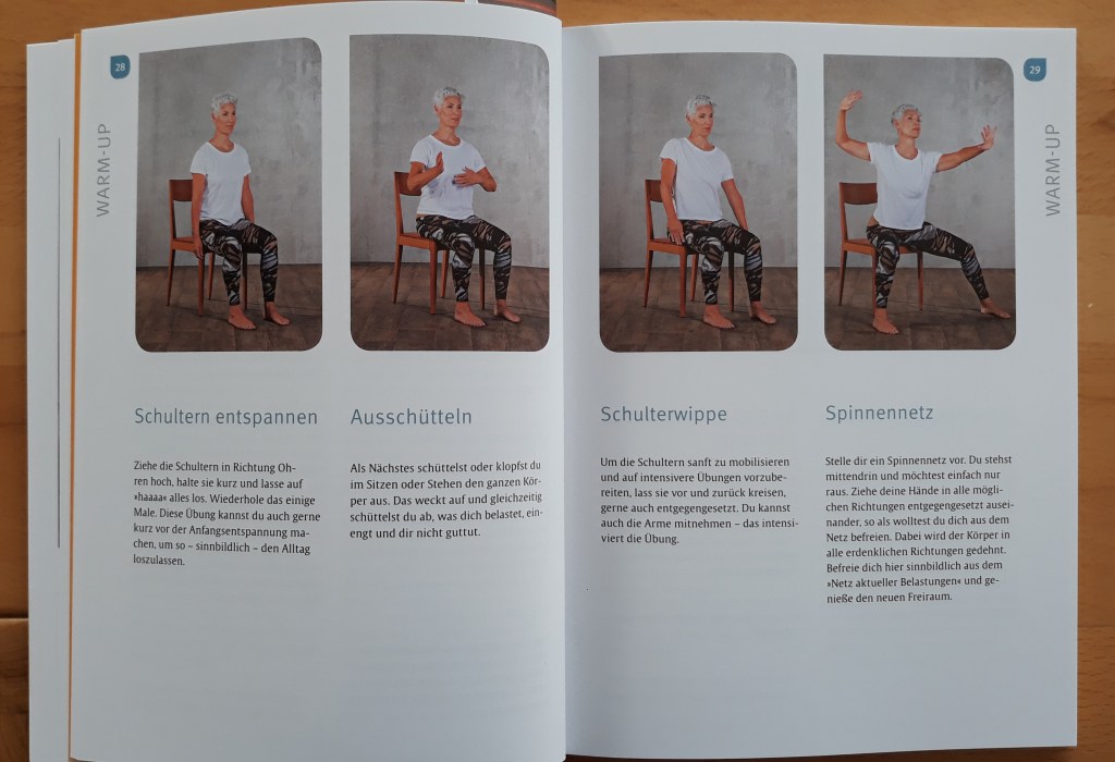 Ich bin begeistert, denn das Angebot Yoga auf dem Stuhl zu machen, eröffnet mir weitere ungeahnte Möglichkeiten. Was heißt das: Neben täglichem Joggen von rund 1-1,5 Stunden, einer Reihe von Workouts, mache ich jetzt zusätzlich zum Ausgleich des Vorhergegangenen noch Yoga-Übungen auf dem Stuhl. Das funktioniert super, dank Kerstin Klimenta und ihrem Buch, und der guten und ausführlichen Anleitung.