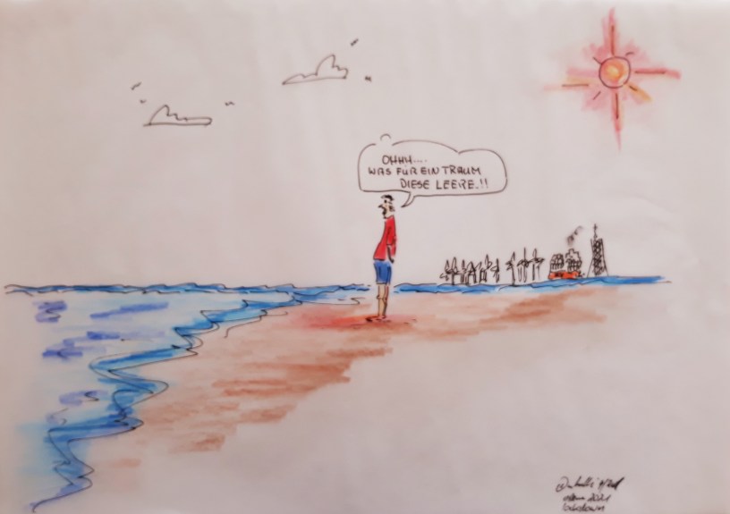 cartulli’s Corona-Cartoon: Die große Cuxhavener-Leere zu Ostern 2021! Cuxhaven verbietet Tagestourismus zu Ostern. Die Strände können dann nur noch von Einwohnern mit 1. Wohnsitz im Landkreis Cuxhaven oder Bremerhaven genutzt werden. SUPER, uns erwartet ein Traum von einer Leere.