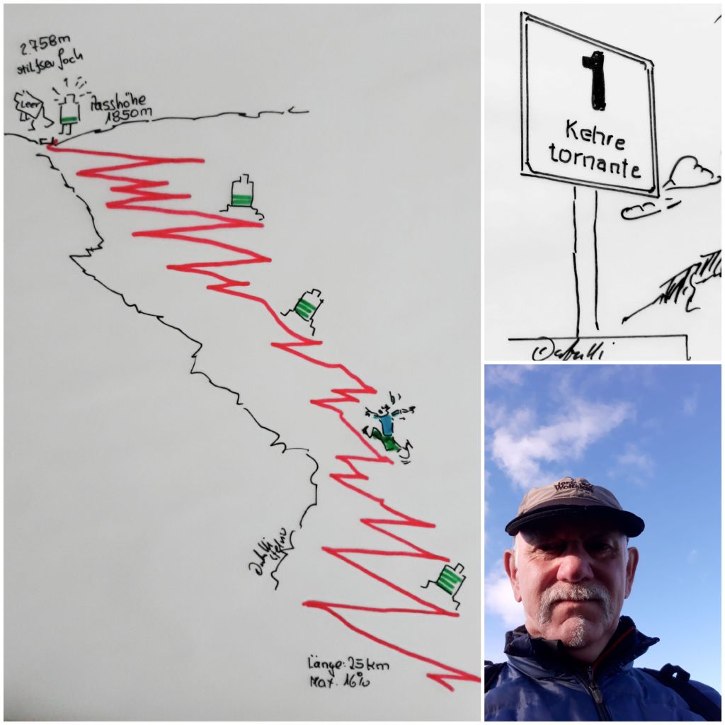 So weit, so gut – ich wollte dann mal per Pedes, also in Laufschuhen, diese 48 Kehren auf das Stilfser Joch rauf laufen. Die berühmte Aussage an Jan Ullrich im Hinterkopf „Quäl dich du Sau“. Eigentlich hätte mir das Streckenprofil schon den Mut nehmen sollen, aber ….. wenn man es nicht ausprobiert hat, weiß auch man nicht ob man es geschafft hätte.