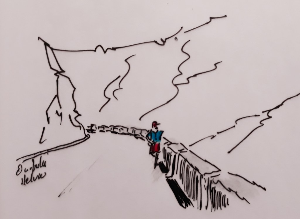 Obwohl relativ wenig Verkehr ist halten immer wieder Autos neben mir und ich höre Fragen wie „Wollen Sie da wirklich rauf laufen? Runter ist doch viel einfacher“. Oder „Soll ich sie ein Stückchen mitnehmen“? Oder „Ich würde das nicht machen“. Na. Es muss ja auch nicht jeder machen. Mir macht so etwas halt Spaß.