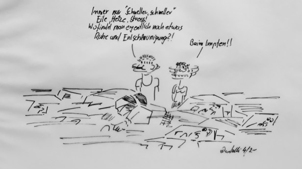 Cuxhaven-Cartoon: Immer nur „Schnell, schneller, Hetze, Eile, Stress“, wo findet man eigentlich noch etwas Ruhe und Endspannung? Beim Impfen!!. Tja, da ist was dran.