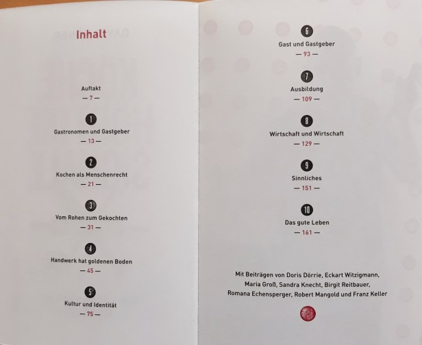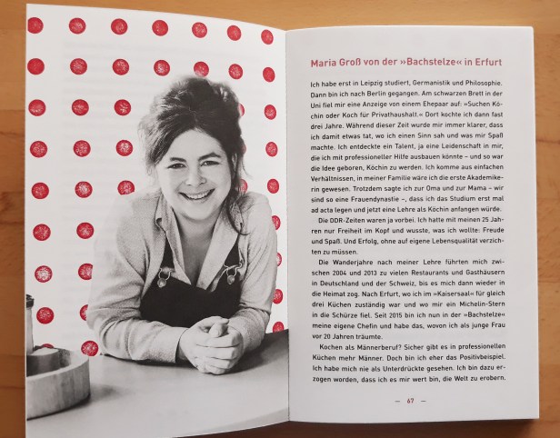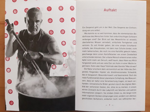 Die Buchgestaltung finde ich, auf den ersten Blick, etwas gewöhnungsbedürftig, es passt aber super zum Inhalt: Festeinband, auf rustikal gestylt, mit rauer Oberfläche. Innen findet man schöne Fotos der Beitragenden. Die Kapitelüberschriften sind in Rot, geschmückt mit Abbildungen der Küchenutensilien. Durch das rustikale Design und die Buchgröße von etwa A5, lässt sich das Buch auch überall mit hinnehmen – an den Strand, beim Arzt oder auch in der U-Bahn.