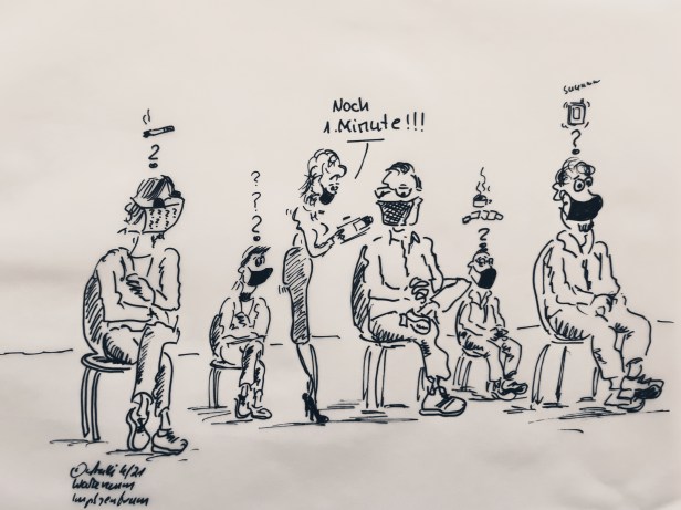 Hier kann man Menschen studieren. Den nervösen Raucher, der seine Zigarette schon in der Hand hält, oder die ältere Dame, die nicht ihre Finger vom Handy lassen kann, obwohl Handynutzung hier untersagt ist – der Rüffel, vom Wachpersonal kommt umgehend, oder den, der nur einfach wartet, bis seine 15 Minuten rum sind. Andere denken schon über die Freiheiten nach, die kommen sollen.