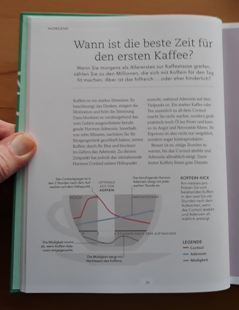 Ich mag dieses Sachbuch. Es ist kurzweilig und muss nicht unbedingt von Anfang bis Ende gelesen werden. Ich suche mir immer das Thema aus, welches mich gerade intertessiert. Der Autor hat sein Werk in Morgen, Mittag, Nachmittag und Nacht unterteilt. Darin werden 200 alltägliche Fragen auf einer Doppelseite beantwortet. Wann ist der erste Kaffee am effektivsten? Wann soll ich Zähne putzen?, und vieles mehr.
