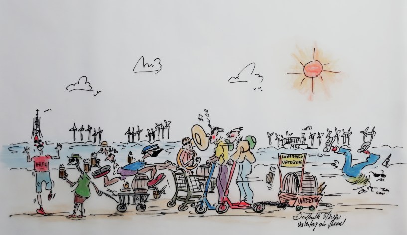Cuxhaven-Cartoon: Der zweite Vatertag im Zeichen der Pandemie ist heute. Die bierselige Tour mit dem Bollerwagen muss aber auch in diesem Jahr ausfallen. Doch wie im letzten Jahr schon aufgefallen, wird das auch 2021 KEINEN interessieren! Und alles wird so aussehen wie immer – Bier in Mengen, kaum Coronaschutz-Massnahmen, betrunkene Väter (oder die, die so etwas sein wollen). Das Geheule am folgenden Tag wird wieder groß sein, wie konnte das bloß passieren? Ja, warum wohl? Ich sage nur Lockerungen, Lockerungen…..und keiner nimmt Rücksicht! Man hätte es doch wissen sollen. Und sag mir bloß keiner, ich hätte nicht darauf hingewiesen.