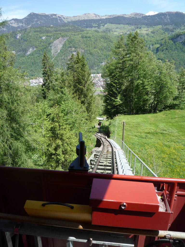 Elias Flotron, Ingenieur aus Meiringen, bewarb sich um eine eidgenössische Konzession für den Bau und Betrieb der 714 Meter langen Bahn. Die Bahn überwindet 244 Höhenmeter und benötigt dazu eine Fahrzeit von 7 Minuten. Ihr Antrieb ist elektrisch und es gibt eine Kreuzungsstelle für berg- und talwärts fahrende, je 24 Personen fassenden Wagen.