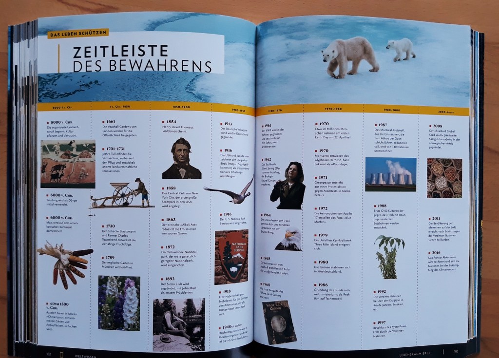 Damit einem bei diesem tollen Buch nichts entgeht, sollte man sich die meistens zwei Seiten umfassenden Texte zu einem Thema durchlesen, aber die vielen tollen Bilder nicht links liegen lassen. Denn sie sind neben den Informationen, das „Salz in der Suppe“ dieses Buches. Richtig gut finde ich auch die immer wieder zu findenden „Zeitleisten“ und die immer wieder auftauchenden „Top-Ten-Hitlisten“.