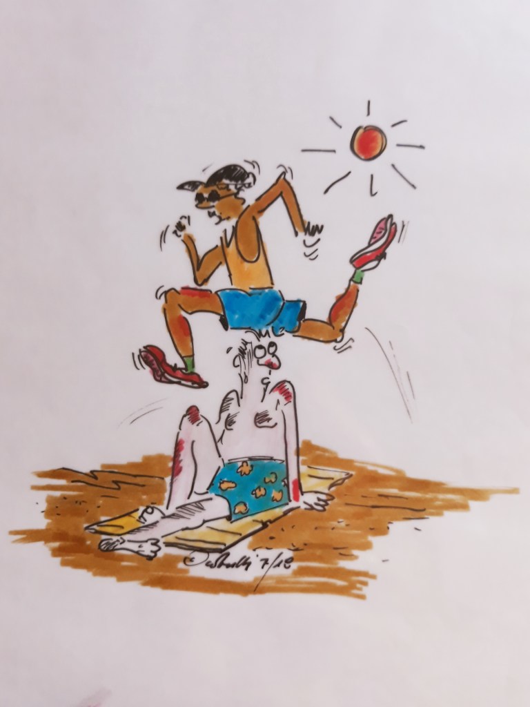 Dieser Sportler kann eines überhaupt nicht: Auf seinem Handtuch liegen und sich sonnen. Dieser Strandtyp hat ständig Hummeln im Hintern. Urlaub am Meer macht er nur seinem Partner/in zuliebe. Viel lieber hätte er einen Berglauf auf den Kilimandscharo oder einen Marathon über die Chinesische Mauer gebucht. Seinen Bewegungsdrang muss er jetzt am Strand ausleben und da sind ihm die Menschen am Strand eigentlich im Wege. So springt und hüpft er über die Badegäste, das man glauben könnte er trainiert für den 3000m Hindernislauf. Und so läuft er und läuft und läuft…