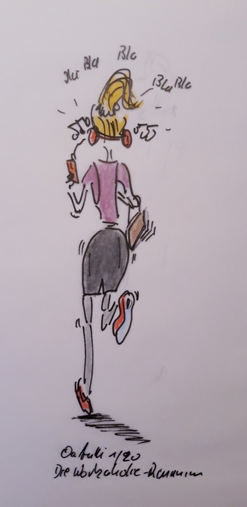 Da ist die Workaholic-Läuferin, so wie ich sie nenne. Sie ist immer nur am Telefonieren. Wer Karriere machen will, muss seine Zeit im Griff haben. Auch wenn das heißt, dass man eben in die Arbeit joggt und dabei arbeitet und kreativ ist. Aber hey, angeblich soll man doch eh in einem Tempo laufen, in dem man sich noch gemütlich unterhalten kann. Man braucht halt Rucksack und Headset und dann funktioniert auch das Running-Business.