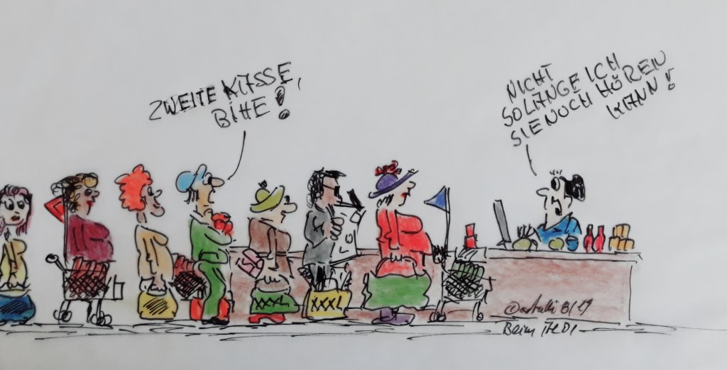 Der Vordrängler ist auch der Kassenschlangentrottel: Das sind die schlimmsten. Anderthalb bis zwei Meter Abstand in der Schlange an der Supermarktkasse – hallo warum geht das nicht? Immer noch Fehlanzeige bei manchen. Und diese Abstandstrottel regen sich dann darüber auf, dass andere Leute in dieser Krise so dumm sind. Dabei bemerken sie nicht, dass der Abstand zur Person vor ihnen nur noch 30 Zentimeter beträgt.