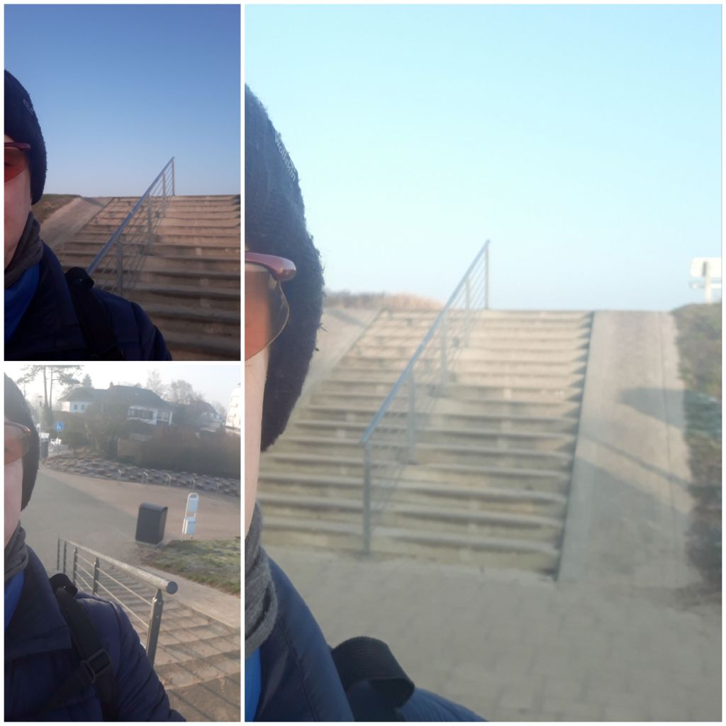 So, nächste Treppe in ca. 1500 Metern mit sehr hohen Stufen. Als ob es nicht auch eine Norm für so etwas gäbe. Aber was soll’s! Rauf und runter und weitere zur letzten Treppe. Es sind noch 100 Meter. Der Wind treibt mich voran in Richtung Duhnen. Dann zum letzten „rauf und runter“ und FERTIG! Mein Ziel ist für heute erreicht.