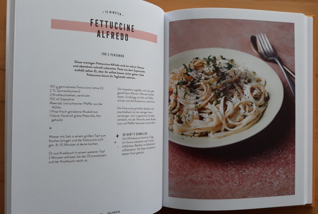 Warum ich das Buch empfehle: Dieses Kochbuch hat mich sofort angesprochen. Tolles Design, prima Umsetzung und klasse Rezepte – was will man mehr? Alles ist einfach und schnell nachgekocht. Das Buch ist, meiner Meinung nach, sehr gut strukturiert, man findet sich schnell zurecht und die Bilder zu den einzelnen Rezepten regen ganz sicher (bei mir wenigstens) den Appetit an. Was ganz toll ist, die Vielfalt der Rezepte, das macht das Kochen nie langweilig. Also, kurz gesagt, dieses Buch zeigt, wie einfach vegane Ernährung sein kann. Kaufen, Nachkochen, Lecker!!