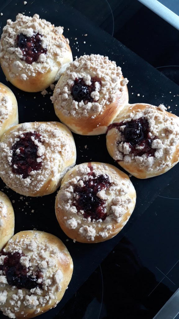 - Eigelb mit etwas Milch mischen. Die Kugeln dünn damit bestreichen und mit den vorbereiteten Streusel bedecken. Wer mag, kann einen Klecks Marmelade obendrauf geben.