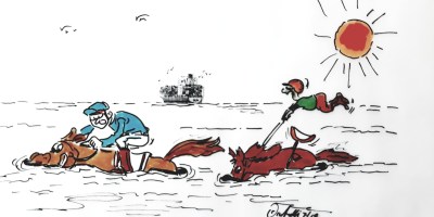 Cuxhaven-Cartoon: Trotz Corona findet das Duhner Wattrennen 2021 am Wochenende (28/29.08.21) statt. Der Zeitraum für die Pferderennen – zwischen Ebbe und Flut – ist sehr knapp. Hier kam die Flut schneller.