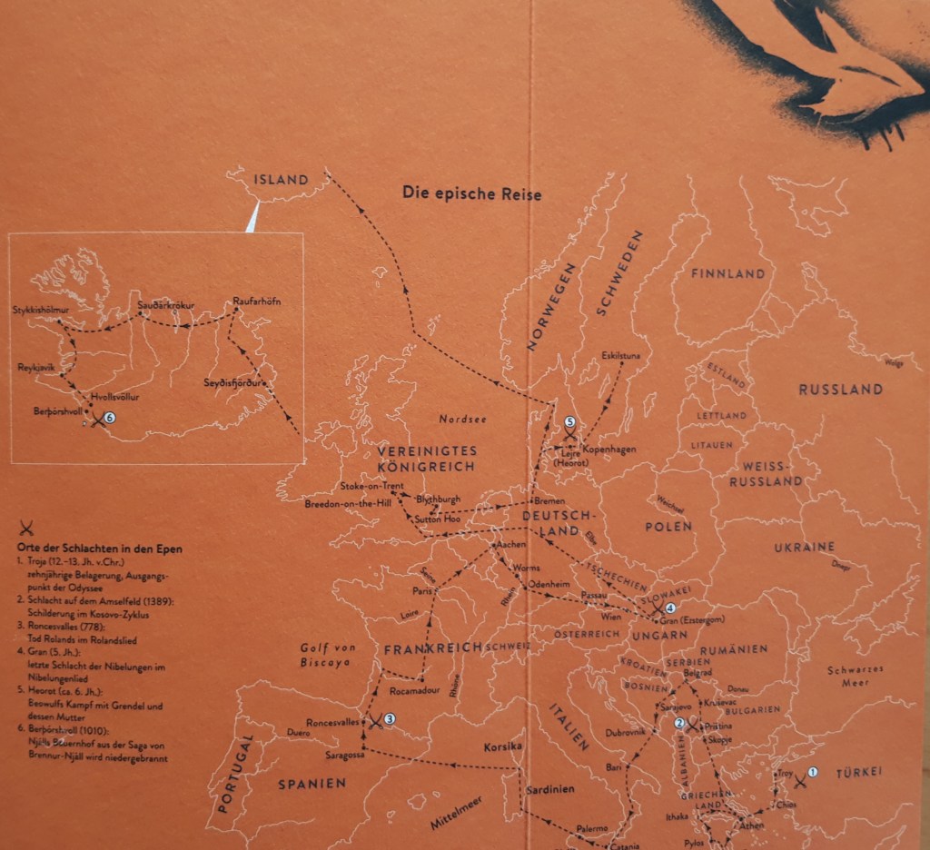 Nach einer einführenden Chronik der Ereignisse folgen die Kapitel Auf den Spuren eines Spätheimkehrers – Die Odyssee, Klagelied auf eine ewig schmerzhafte Wunde – Der Kosovo-Zyklus, Ein Lied für Europa – Das Rolandslied, Der bittere Geschmack der Götterdämmerung – Das Nibelungenlied, Wie man Monster tötet – Beowulf und Ein Ödland der Gleichen – Die Saga von Brennu-Njal. Eine Karte am Ende des Buches zeigt, wo dies alles stattgefunden hat.