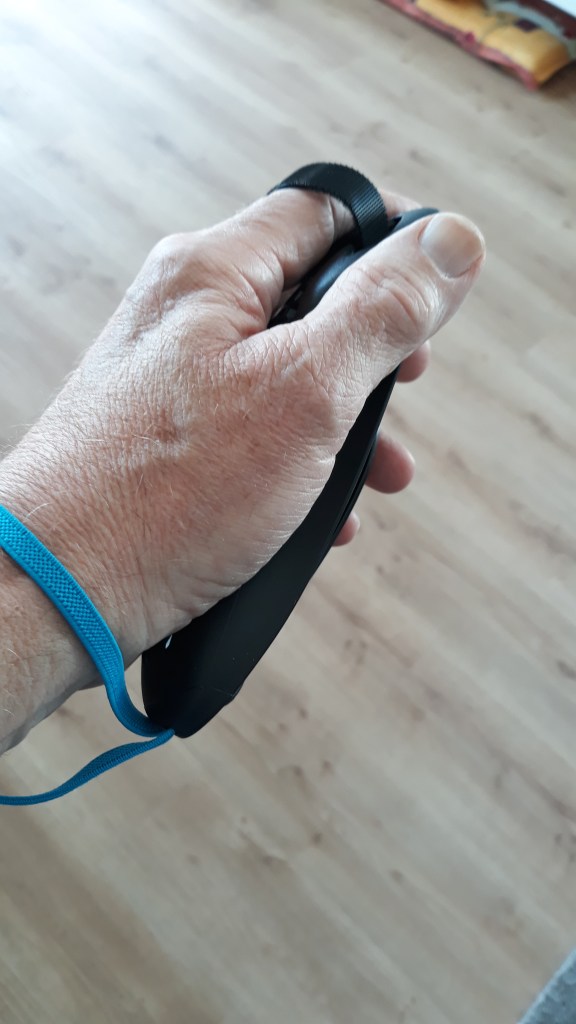 Das Anziehen der Mäuse geht ohne Probleme. Mit der Hand durch die Schlaufe schlüpfen und den Zeigefinger vorne in der Halterung fixieren. Diese ist aus Klettverschluss und kann so leicht verstellt ewerden – und iat somit individuell angepassbar. An der Armschlaufe ist auch ein Halter, den man zuziehen kann, somit liegt die Laufmaus schon nach kurzer Zeit perfek an der Hand.