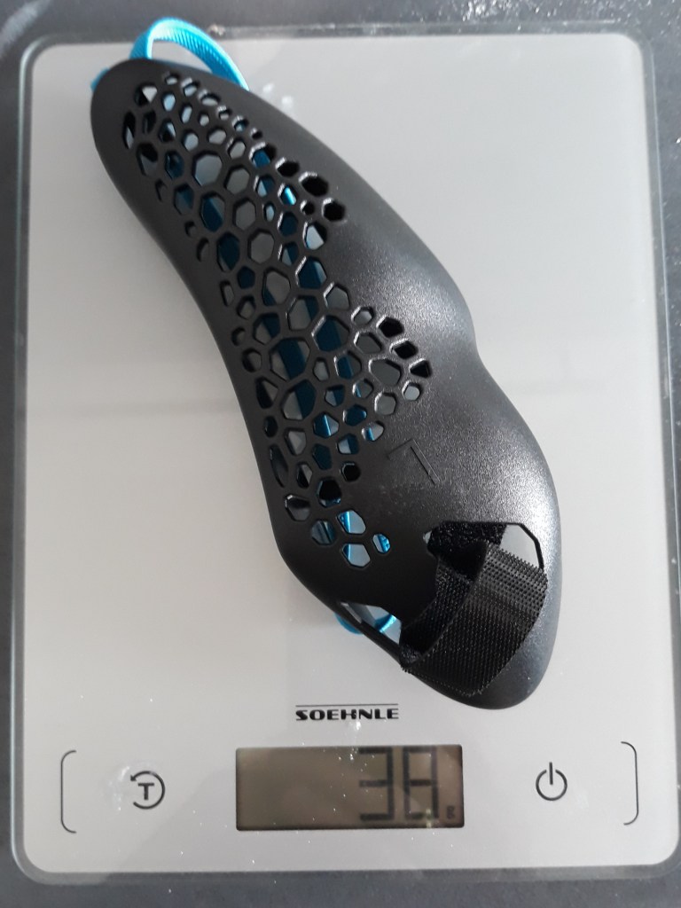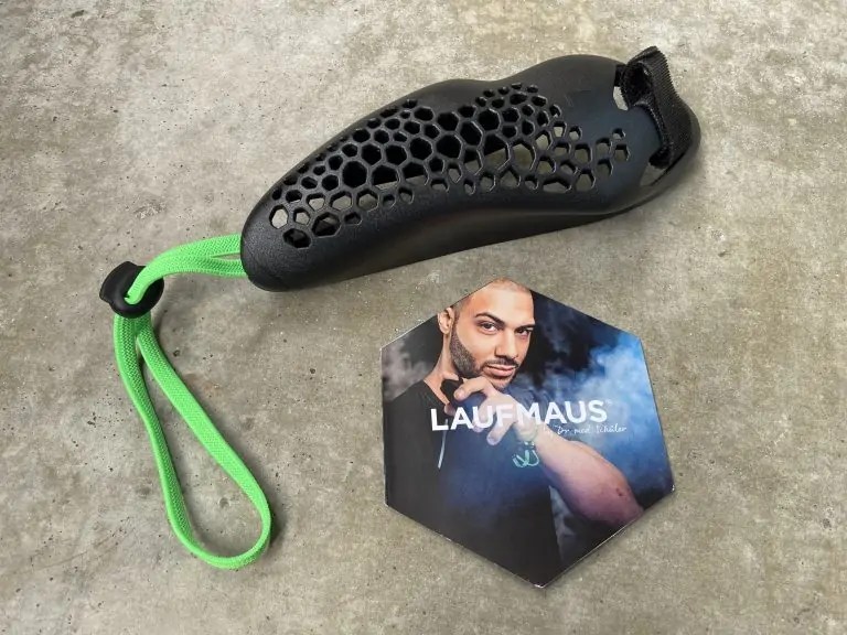 So, auspacken, und los geht’s. Die Laufmaus selbst sieht im ersten Moment etwas merkwürdig aus. Der Kunststoff ist mit vielen Löchern durchsetzt. Aber genau das hilft in Sachen Schweiß und macht die Laufmaus so richtig leicht. Bestellen kann man sie in 2 Größen: Small und Large ( bitte vorther genau nach Voergabe ausmessen) und 7 Farben für die Armschlaufen. Alles in allem, auf den ersten Blick, SUPER. Im Bild seht ihr das größere Modell und dieses wiegt gerade einmal 38 Gramm pro Hand.