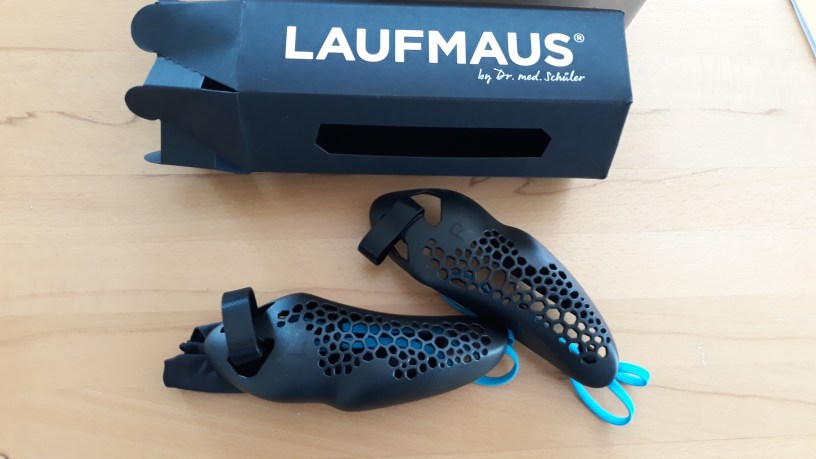 So, auspacken, und los geht’s. Die Laufmaus selbst sieht im ersten Moment etwas merkwürdig aus. Der Kunststoff ist mit vielen Löchern durchsetzt. Aber genau das hilft in Sachen Schweiß und macht die Laufmaus so richtig leicht. Bestellen kann man sie in 2 Größen: Small und Large ( bitte vorther genau nach Voergabe ausmessen) und 7 Farben für die Armschlaufen. Alles in allem, auf den ersten Blick, SUPER. Im Bild seht ihr das größere Modell und dieses wiegt gerade einmal 38 Gramm pro Hand.